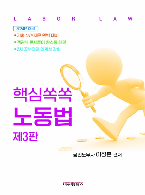 • 도서정보 01. 도서명: 이장훈 핵심쏙쏙 노동법(제3판) 02. 저자명: 이장훈 03. 출판일: 2024년 2월 2일 04. 판 수: 제3판 05. 페이지: 480P 06. 가 격: 31.000원 07. 판 형: 4*6배판 08. ISBN: 9788968211942 09. 출판사: 비앤엠북스