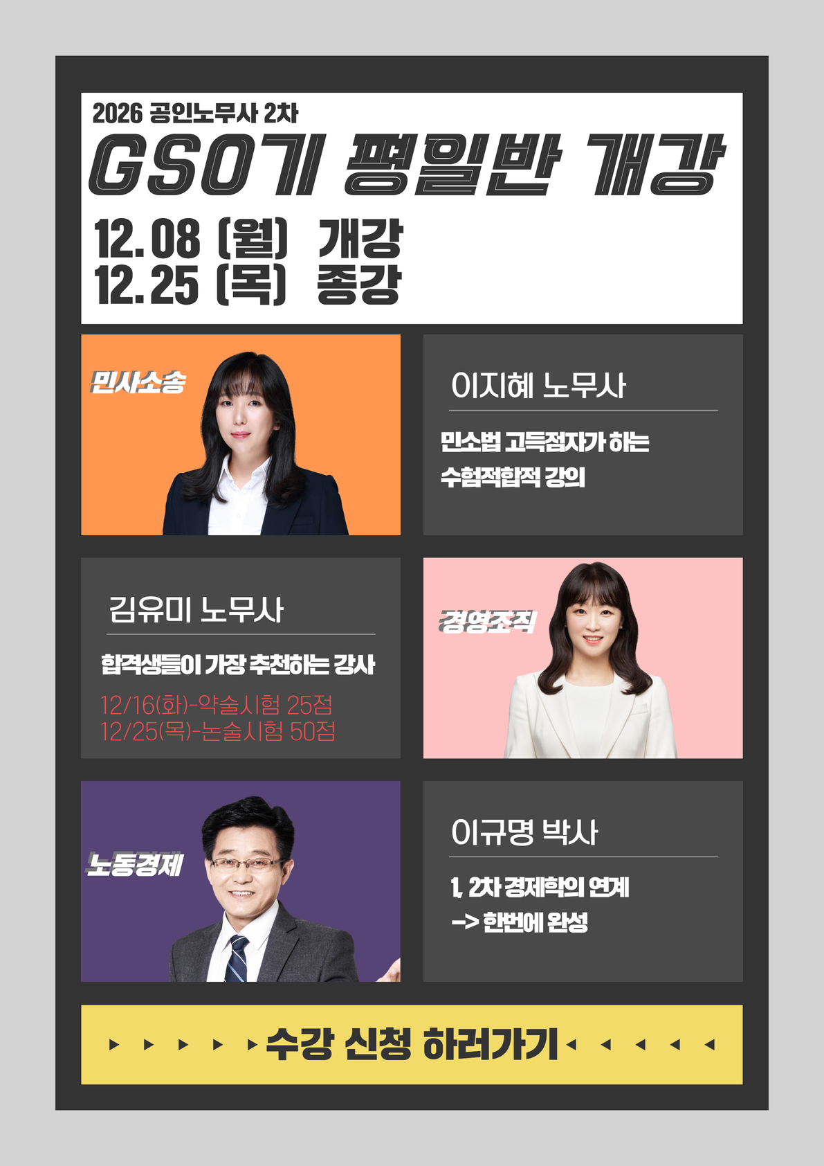 2026 공인노무사 2차 GS0기 평일반 개강 안내 12월 8일(월) 개강합니다. 아래 포스터 참고 부탁드립니다. 👉 수강신청은 홈페이지에서 가능합니다. (실강)2026 김유미 경영조직 GS0기 평일반(온라인첨삭)2026 김유미 경영조직 GS0기 평일반(실강)2026 이지혜 민사소송 GS0기 평일반(온라인첨삭)2026 이지혜 민사소송 GS0기 평일반(실강)2026 이규명 노동경제 GS0기 평일반(온라인첨삭)2026 이규명 노동경제 GS0기 평일반