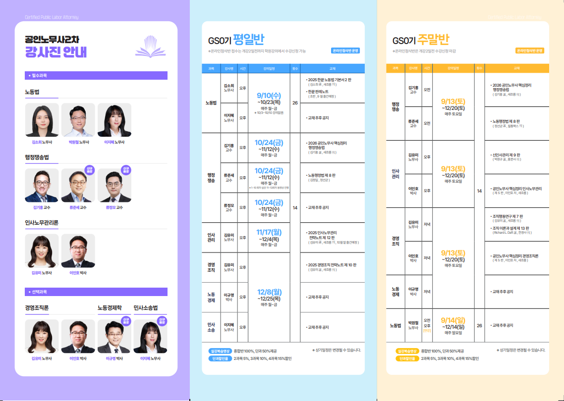2026 공인노무사 2차 GS0기 강의계획서▶노동법*평일반 [ 09.10 (수)-10.23 (목) ]2026 김소희 노동법 GS0기 강의계획서2026 이지혜 노동법 GS0기 강의계획서*주말반 [ 09.14 (일)-12.14 (일) ]2026 박원철 노동법 GS0기 강의계획서▶행정쟁송*평일반 [ 10.25 (월)-11.13 (목) ]2026 김기홍 행정쟁송 GS0기 강의계획서2026 류준세 행정쟁송 GS0기 강의계획서2026 류정모 행정쟁송 GS0기 강의계획서*주말반 [ 09.13 (토)-12.20 (토) ]2026 김기홍 행정쟁송 GS0기 강의계획서2026 류준세 행정쟁송 GS0기 강의계획서▶인사관리*평일반 [ 11.17 (월)~12.4 (목) ]2026 김유미 인사관리 GS0기 강의계획서*주말반 [ 09.13 (토)-12.20 (토) ]2026 김유미 인사관리 GS0기 강의계획서2026 이인호 인사관리 GS0기 강의계획서※선택과목▶경영조직*평일반 [ 12.08 (월) - 12.25 (목) ]2026 김유미 경영조직 GS0기 강의계획서*주말반 [ 09.13 (토)-12.20 (토) ]