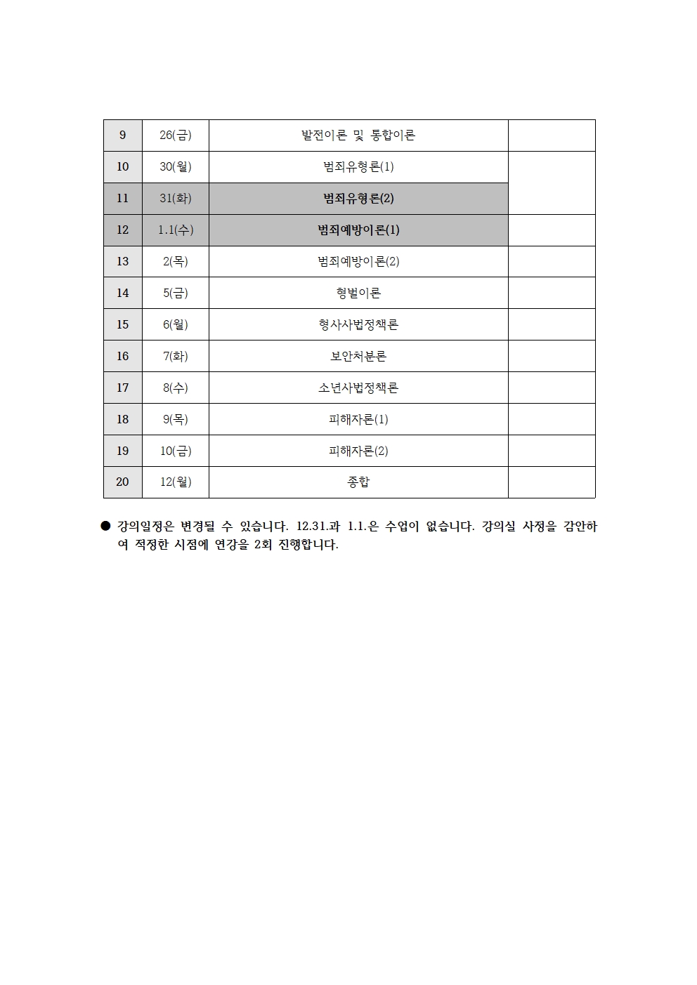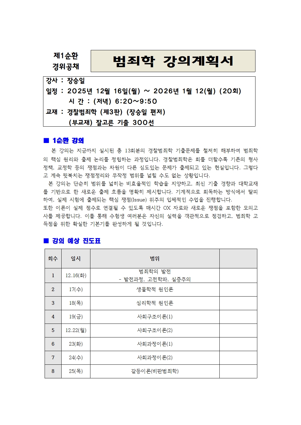 | 76기 대비 장승일 범죄학 1순환 강의계획서