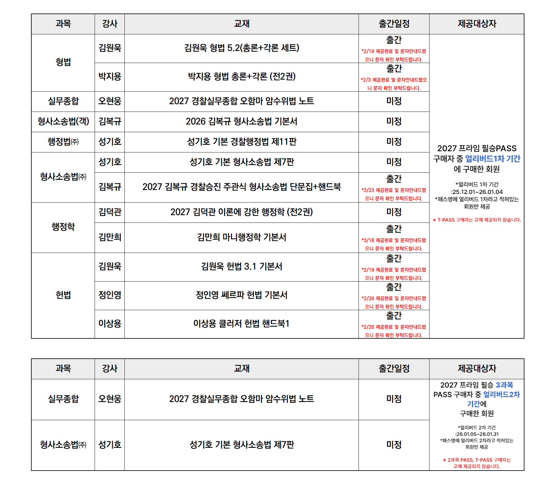 ■ 2027 프라임 필승PASS 1차·2차 얼리버드 교재는 PASS 구매 즉시 제공이 아닌 '교재출간시' 제공됩니다.■ 2027 승진대비 신규강의 개강일정은 미정으로 2026 승진시험 이후 안내드리겠습니다. |