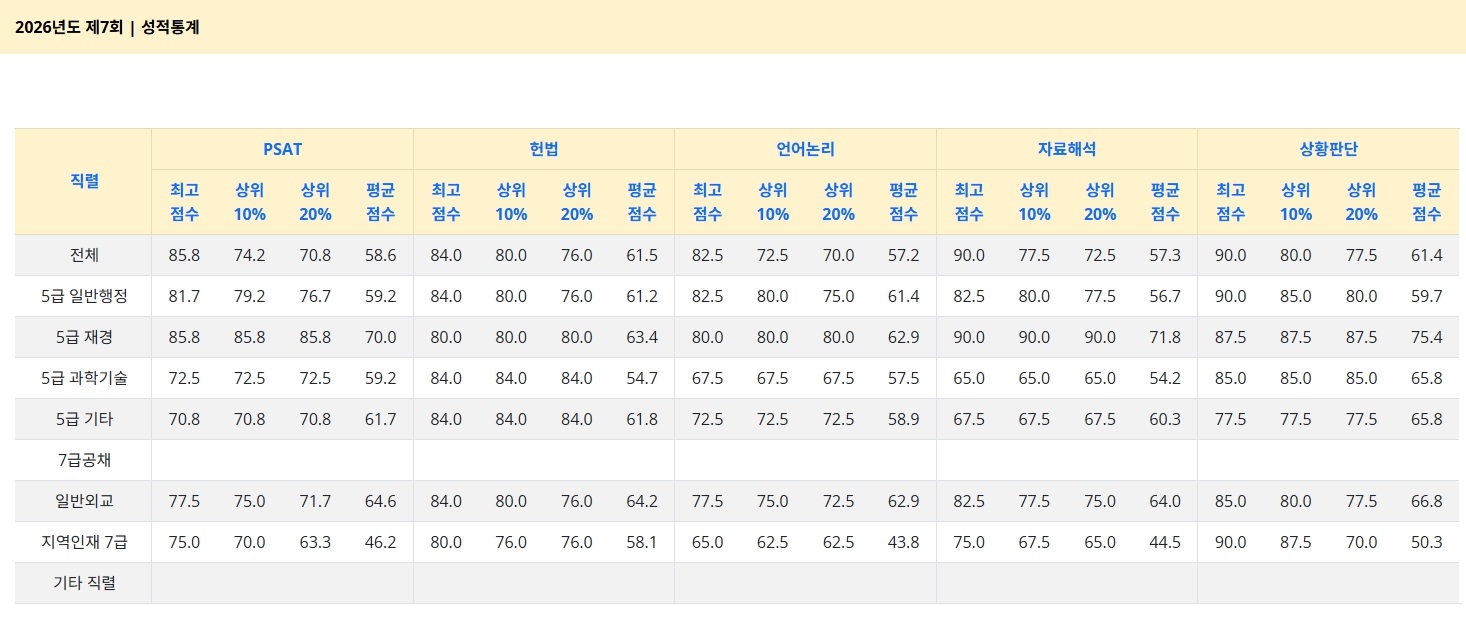 | [2026 대비 PSAT 전국모의고사] 제7회 성적통계 요약 및 정오 공지